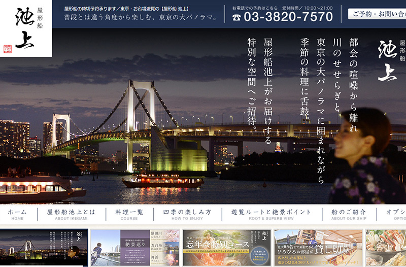 屋形船の貸切予約なら、東京・お台場遊覧の池上へ。普段とは違う角度から東京の大パノラマをお楽しみください。景色を見ながら、当船自慢のご料理もぜひご堪能ください。ネットで予約OK!