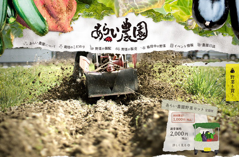 京都の京北(けいほく)と向島(むかいじま)で農業を営む、あらい農園のオフィシャルwebサイトです。無農薬・有機肥料で旬の野菜を育て、京都を中心に採れたての野菜の個配や野菜の振売を行っています。