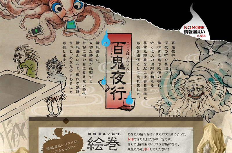 古くは人の理解を超える異常な現象を起こす非日常的な存在を妖怪として恐れました。情報漏えいは、大切な情報が氾濫する社会に潜む目に見えない恐怖。情報漏えいこそ、現代の妖怪。きっと、あなたのまわりにも存在します…。